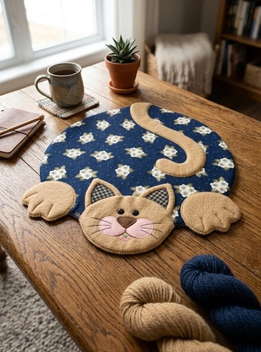 The Reversible Felt & Appliqué Cat-Shaped Mug Rug- Tutorial is a delightful project designed for craft enthusiasts who want to