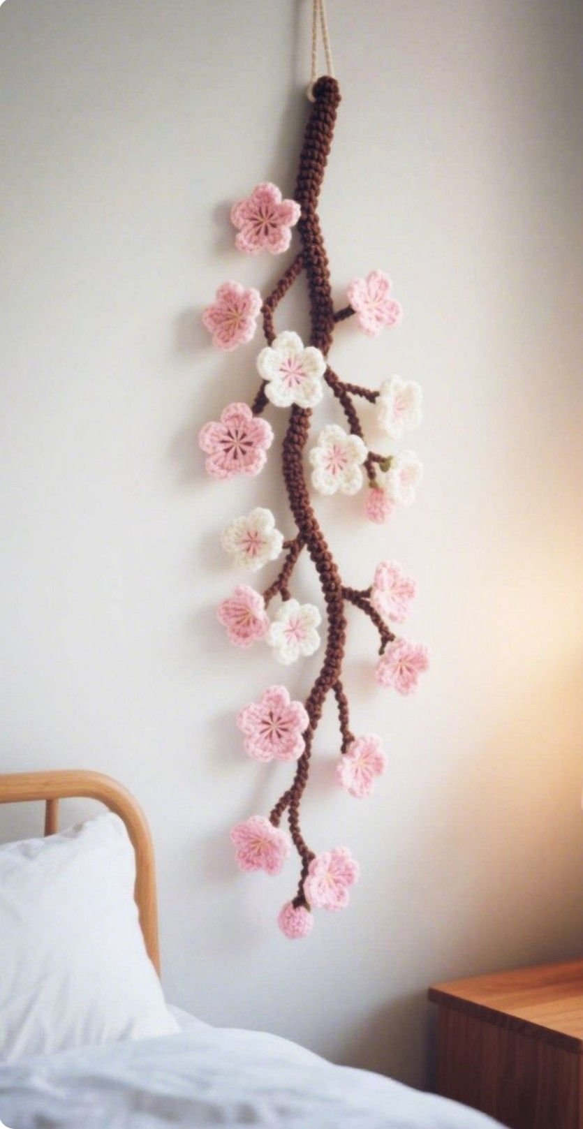 Once you have mastered the Crochet Cherry Blossom- Pattern, the possibilities for decoration are virtually endless. One of the most popular uses is creating a crochet cherry blossom branch. By attaching your finished flowers to real dried branches or wire wrapped in brown yarn, you can create a permanent spring centerpiece for your dining table or mantle.