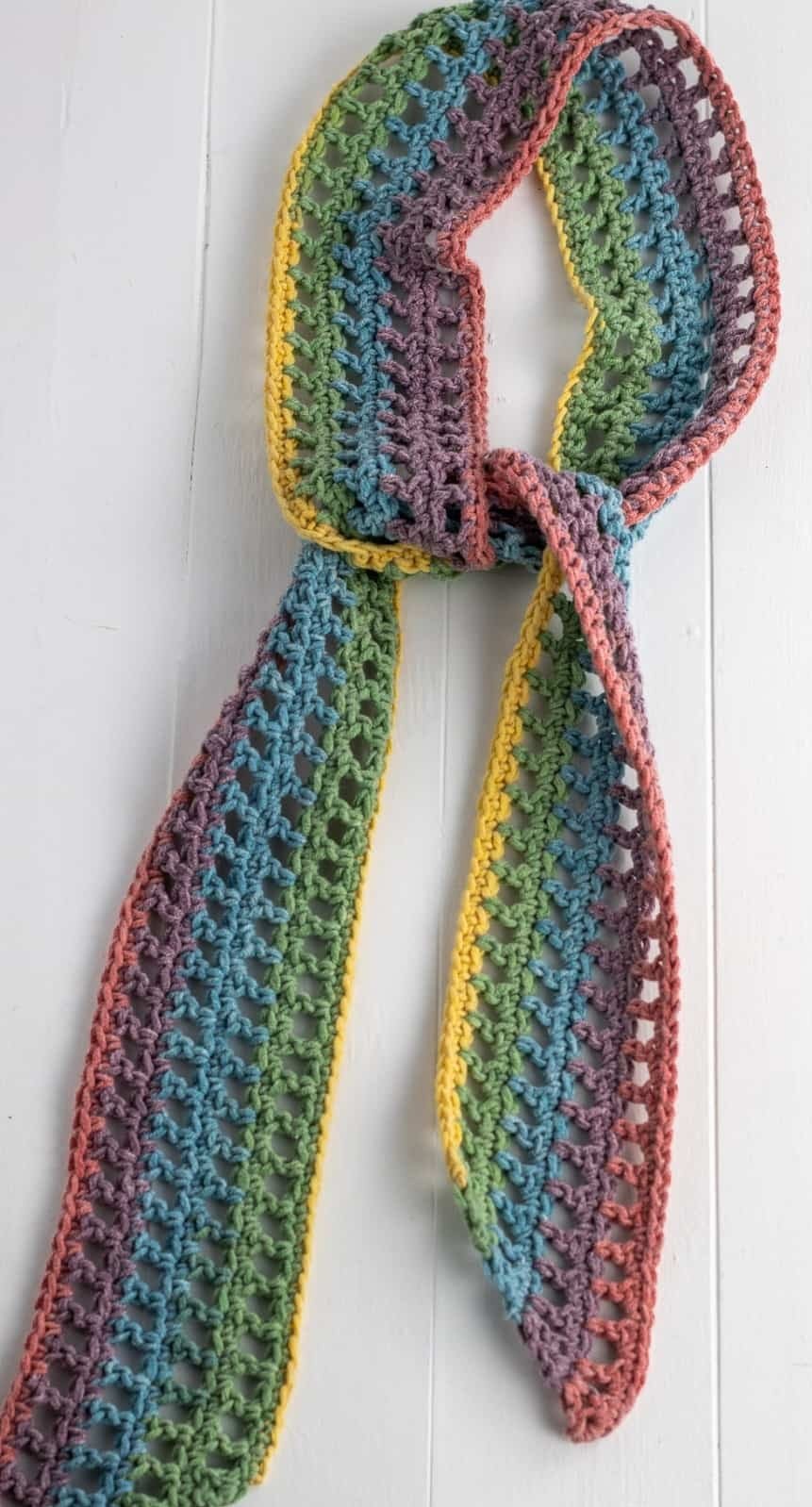 A: Follow the yarn manufacturer’s care instructions. Most cotton and acrylic scarves can be machine washed on gentle cycles and air dried.