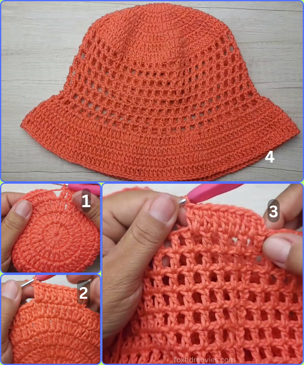 A typical crochet sun hat – pattern starts from the crown, gradually expanding outward in rounds. This top-down approach allows for easy adjustments in size and style as you go.