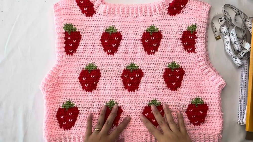 The “ribbing” at the bottom of the Crochet vest with strawberry print – Pattern is usually done using Front Post and Back Post Double Crochets. This creates a stretchy, knit-like texture that hugs the waist. When you reach this stage of the pattern, ensure you are using the smaller hook mentioned previously. This contrast in texture between the ribbed edges and the “berry-filled” body is what gives the Crochet vest with strawberry print its professional, boutique-inspired look that is so popular on social media.