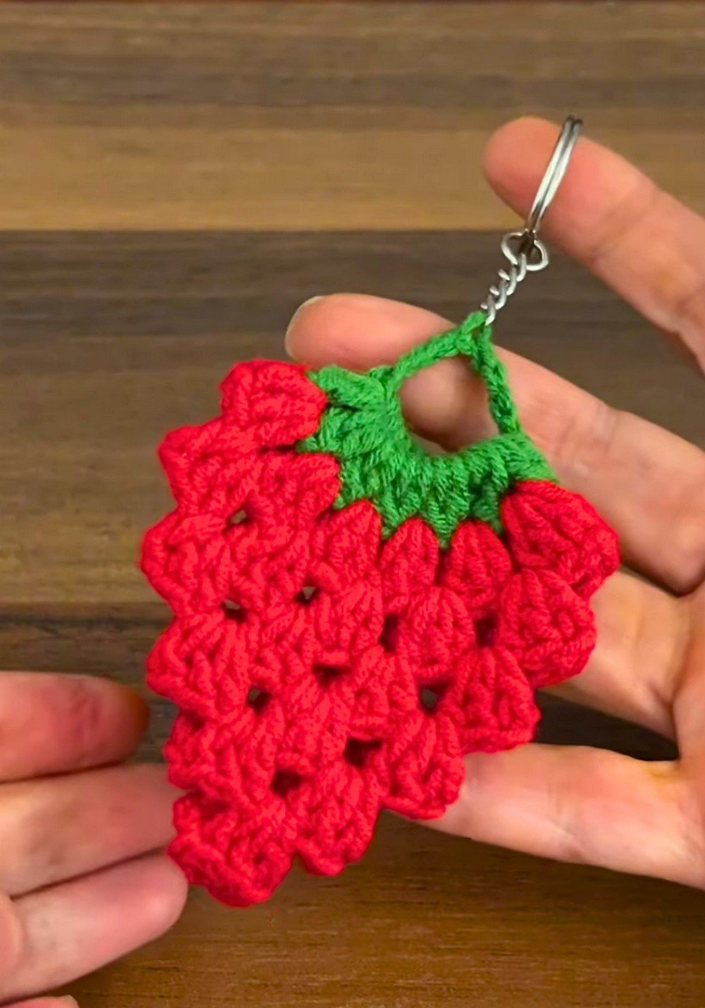 Attaching the hardware is the final construction step in the Strawberry Keychain Crochet – Pattern. You can use a small scrap of green yarn to create a loop, or attach the metal jump ring directly through the crochet fabric. Ensure that you go through multiple strands of yarn so the weight of the keys doesn’t tear the crochet work over time. Strength is just as important as aesthetics here.