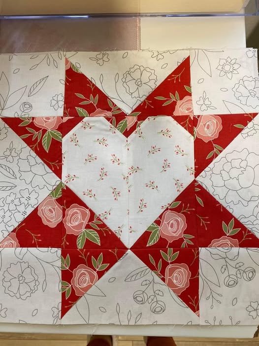 In an Eight-Pointed Star Quilt with Heart – Tutorial, the central heart block should ideally be the same size as the square that would normally occupy the center of an eight-pointed star. Usually, this is a square that matches the side length of your diamonds.