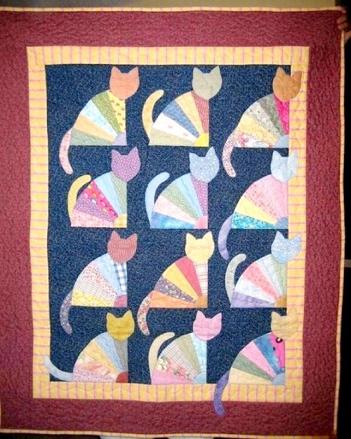 It is a whimsical quilt pattern featuring stylized cat blocks made from various geometric fabric pieces.