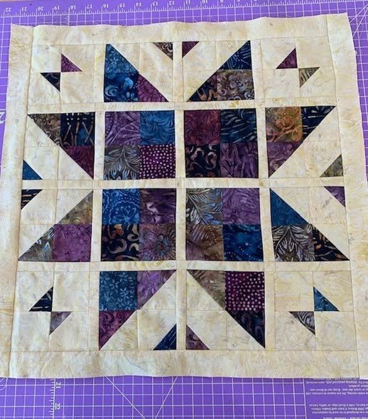 Lay out all your pieces to form the full block. You should have a 3×3 grid: the center square in the middle, four star-point units around it, and background squares in the corners. Double-check your layout before sewing to ensure the star points face the correct direction.
