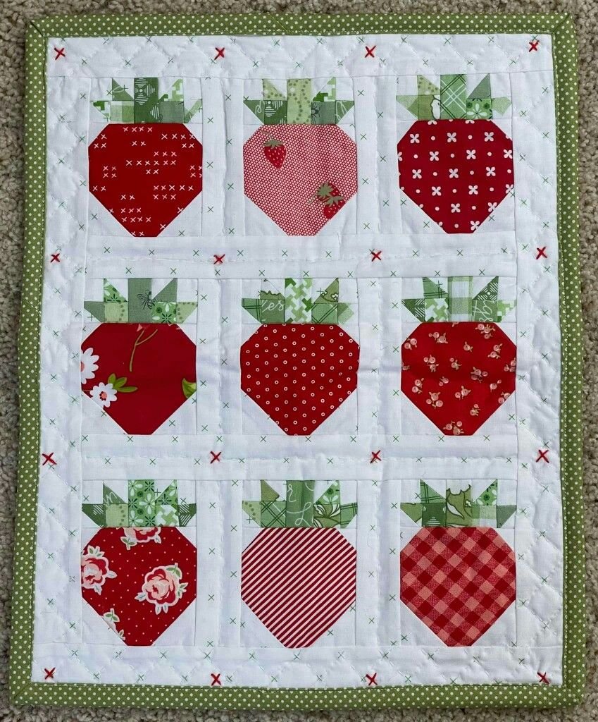 Create a set of strawberry-themed mug rugs for summer table settings. Add a few strawberry blocks, quilt them with batting and backing, and bind the edges with colorful bias tape for a polished finish.