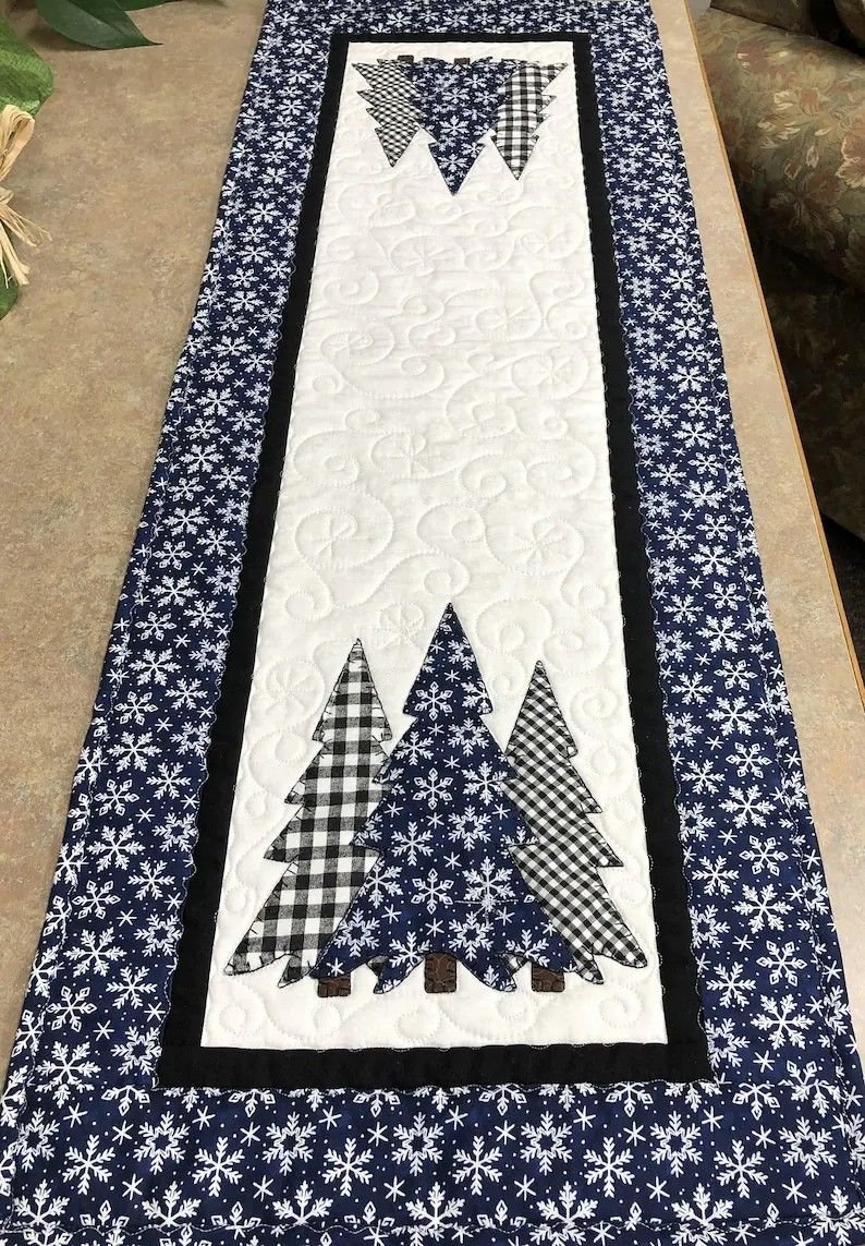 For a winter-themed version, use dark greens, blues, and whites to represent snowy forests. Adding small embroidered snowflakes or metallic thread details can make your table runner sparkle during the holidays. You could even add a few red and gold accents for a Christmas feel.